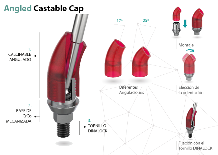 The union of the angled castable cap with the milled Co-Cr base is achieved by friction, and it is fixed to the implant with our DINALOCK screw.