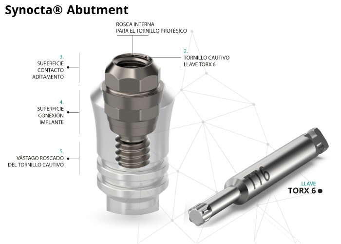 The Synocta® Abutment is a component made of Titanium Grade 5 with a mirror-polished finish to prevent bacterial plaque adhesion.