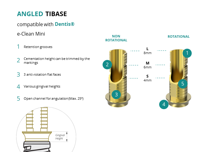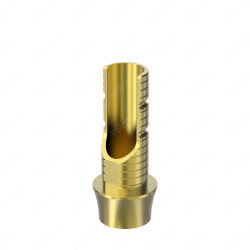GT-Medical's Angled Ti-Base are compatible with e-Clean Mini implants from Dentis®, ensuring a stable and long-lasting connection between the implant and the prosthesis, while also allowing angulations to be corrected up to 25 degrees. They are made entirely of Titanium Grade 5 with a yellow anodizing for a more aesthetic finish. They have a cementation trunk that can be cut to various heights with an open channel to allow angulation, 3 flat faces to perform the anti-rotating function and a gingival body of various heights, depending on the type of connection.