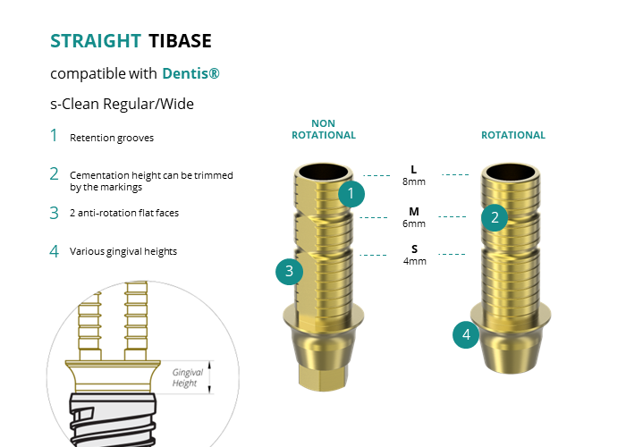 GT-Medical's Ti-Base are compatible with s-Clean Regular/Wide implants from Dentis®, allowing a stable and long-lasting connection between the implant and the prosthesis. They are made entirely of Titanium Grade 5 with a yellow anodized for a more aesthetic finish. They have a cementation trunk that can be cut to various heights, 2 flat faces to perform the anti-rotating function and a gingival body of various heights, depending on the type of connection.