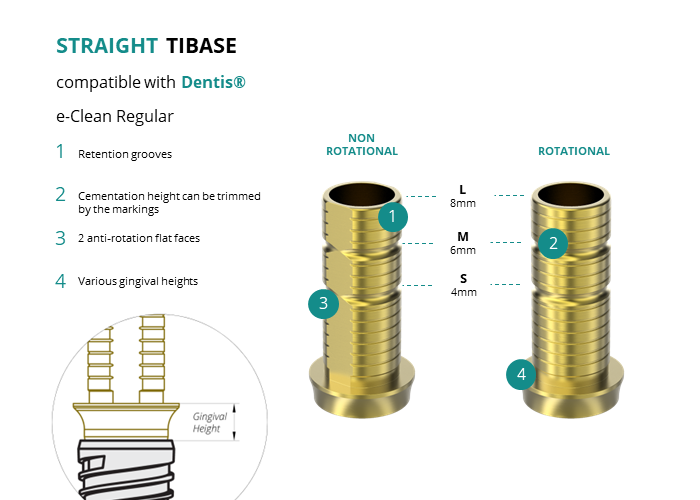 GT-Medical's Ti-Base are compatible with e-Clean Regular implants from Dentis®, allowing a stable and long-lasting connection between the implant and the prosthesis. They are made entirely of Titanium Grade 5 with a yellow anodized for a more aesthetic finish. They have a cementation trunk that can be cut to various heights, 2 flat faces to perform the anti-rotating function and a gingival body of various heights, depending on the type of connection.