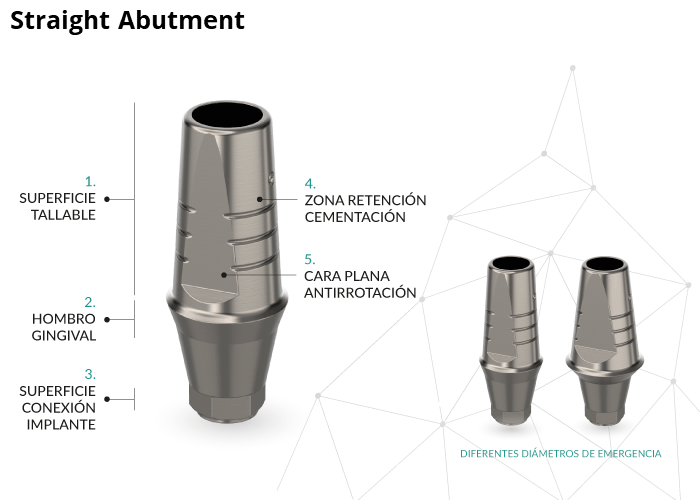 The connection of the Straight Abutment to the prosthetic structure is achieved by cementation, while the connection to the implant is achieved with the corresponding screw.