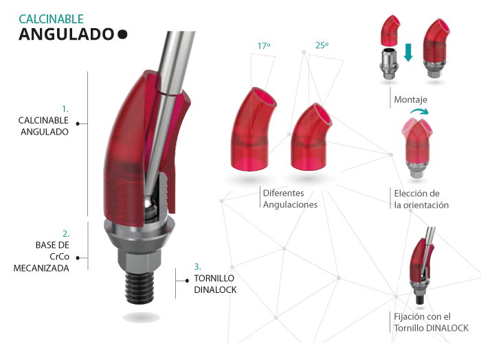 La unión del calcinable angulado con la base de CrCo mecanizada se realiza mediante fricción, y se fija  al implante con nuestro tornillo DINALOCK.