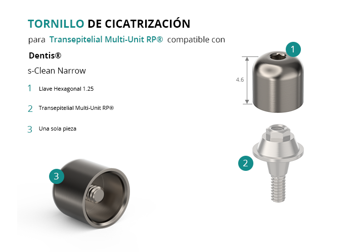 GT-Medical ofrece un Tornillo de Cicatrización para el Transepitelial Multi-Unit® RP (tipo Nobel®) compatible con la línea de implantes s-Clean Narrow de la marca Dentis®, está fabricado en Titanio Grado 5, tiene un diámetro de 4.8mm, y una altura total de 4.6mm.