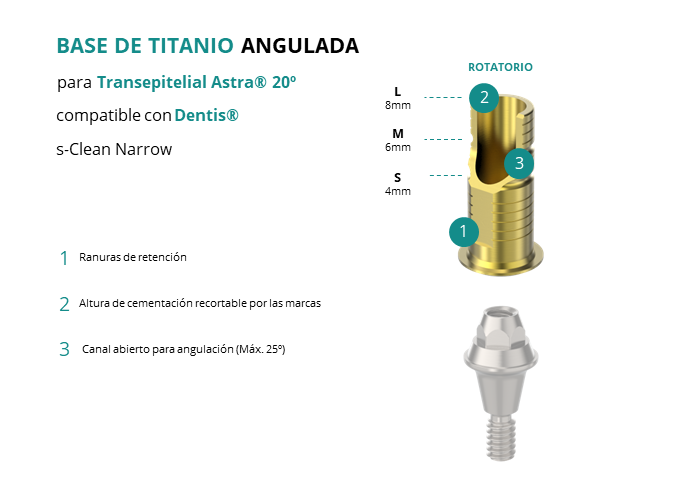 Las Ti-Base Anguladas de GT-Medical son compatibles con los implantes s-Clean Narrow de Dentis®, lo que asegura una conexión estable y duradera entre el Transepitelial Astra® 20º y la prótesis, permitiendo además corregir angulaciones de hasta 25 grados. Están compuestas en su totalidad por Titanio de Grado 5 con un anodizado dorado para un acabado más estético. Poseen un tronco de cementación ranurado y recortable a varias alturas.