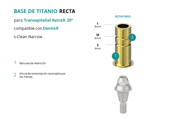 Las Ti-Base Rectas de GT-Medical son compatibles con los implantes s-Clean Narrow de Dentis®, permitiendo una conexión estable y duradera entre el Transepitelial Astra® 20º y la prótesis. Están compuestas en su totalidad por Titanio de Grado 5 con un anodizado dorado para un acabado más estético. Poseen un tronco de cementación ranurado y recortable a varias alturas.