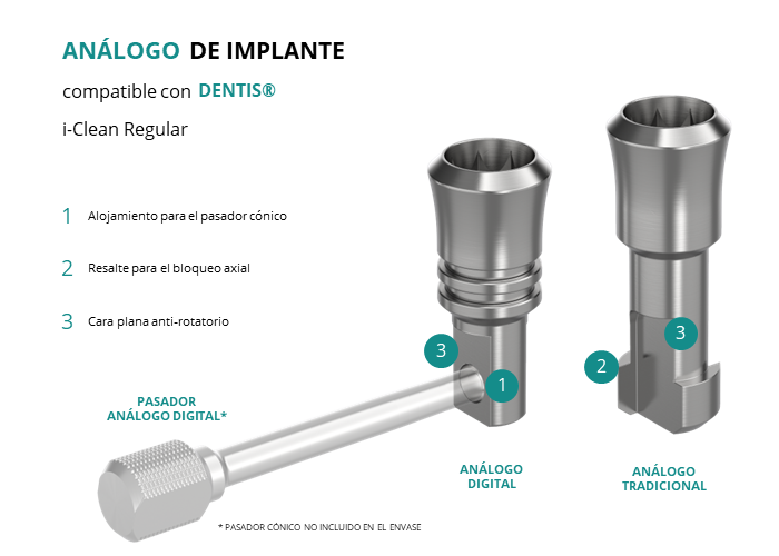 El análogo de GT-Medical compatible con la línea de implantes i-Clean Regular de la marca Dentis®, está fabricado en Acero Inoxidable, tiene un diámetro de 4.8mm, y replica con exactitud la conexión de este implante de Dentis®.