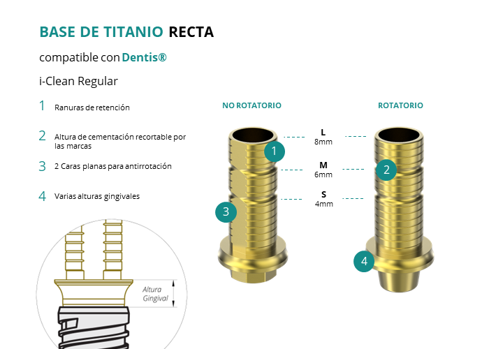 Las Ti-Base Rectas de GT-Medical son compatibles con los implantes i-Clean Regular de Dentis®, permitiendo una conexión estable y duradera entre el implante y la prótesis. Están compuestas en su totalidad por Titanio de Grado 5 con un anodizado dorado para un acabado más estético. Poseen un tronco de cementación recortable a varias alturas, 2 caras planas para realizar la función antirotativa y un cuerpo gingival de varias alturas, dependiendo del tipo de conexión.