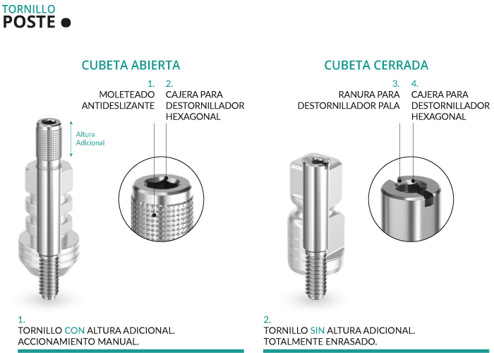 • Para Cubeta Abierta, son tornillos con altura adicional para que sobresalgan por encima del poste de impresión. Poseen una superficie superior moleteada antideslizante para facilitar un primer apriete manual (opcional), y una cajera hexagonal para realizar un segundo apriete mediante un destornillador.