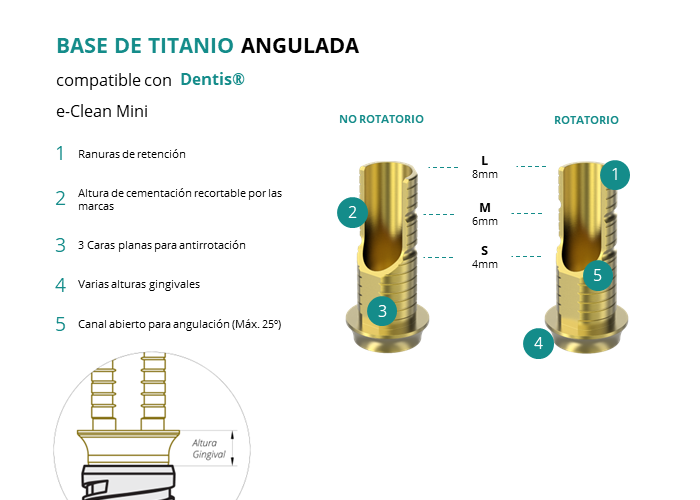 Las Ti-Base Anguladas de GT-Medical son compatibles con los implantes e-Clean Mini de Dentis®, facilitando una conexión estable y duradera entre el implante y la prótesis, y permitiendo corregir angulaciones de hasta 25 grados. Están compuestas en su totalidad por Titanio de Grado 5 con un anodizado dorado para un acabado más estético. Poseen un tronco de cementación recortable a varias alturas con canal abierto para permitir angulación, 3 caras planas para realizar la función antirotativa y un cuerpo gingival de varias alturas, dependiendo del tipo de conexión.
