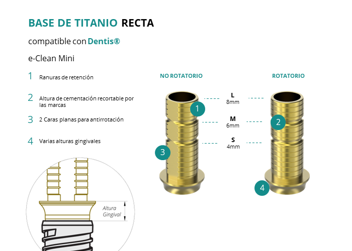 Las Ti-Base Rectas de GT-Medical son compatibles con los implantes e-Clean Mini de Dentis®, permitiendo una conexión estable y duradera entre el implante y la prótesis. Están compuestas en su totalidad por Titanio de Grado 5 con un anodizado dorado para un acabado más estético. Poseen un tronco de cementación recortable a varias alturas, 2 caras planas para realizar la función antirotativa y un cuerpo gingival de varias alturas, dependiendo del tipo de conexión.