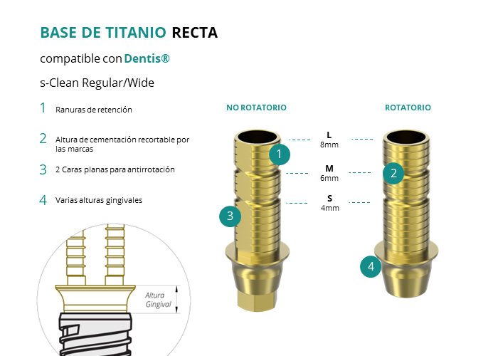 Las Ti-Base Rectas de GT-Medical son compatibles con los implantes s-Clean Regular/Wide de Dentis®, permitiendo una conexión estable y duradera entre el implante y la prótesis. Están compuestas en su totalidad por Titanio de Grado 5 con un anodizado dorado para un acabado más estético. Poseen un tronco de cementación recortable a varias alturas, 2 caras planas para realizar la función antirotativa y un cuerpo gingival de varias alturas, dependiendo del tipo de conexión.