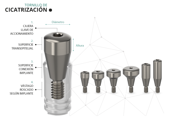 La superficie transepitelial, tiene una altura que varía entre 1 mm y 5 mm según el modelo del implante. El diámetro de emergencia es variable dependiendo de la pieza a rehabilitar.