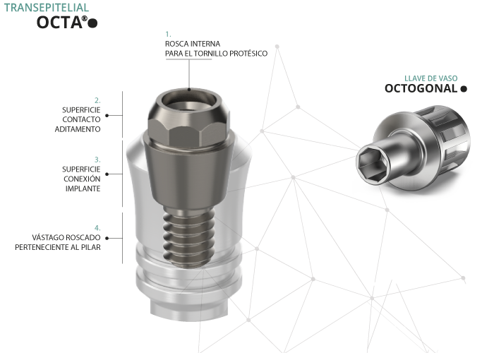 El Transepitelial Octa® es un aditamento fabricado por Gt-Medical en Titanio de grado 5 con acabado micro pulido a espejo para evitar la adhesión de placa bacteriana.