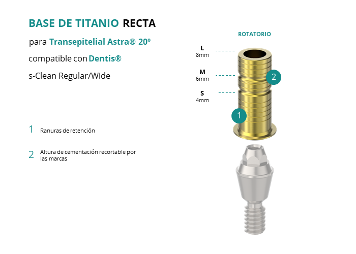 Las Ti-Base Rectas de GT-Medical son compatibles con los implantes s-Clean Regular/Wide de Dentis®, permitiendo una conexión estable y duradera entre el Transepitelial Astra® 20º y la prótesis. Están compuestas en su totalidad por Titanio de Grado 5 con un anodizado dorado para un acabado más estético. Poseen un tronco de cementación ranurado y recortable a varias alturas.