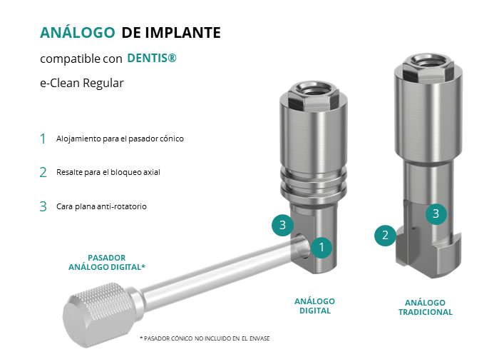 El análogo de GT-Medical compatible con la línea de implantes e-Clean Regular de la marca Dentis®, está fabricado en Acero Inoxidable, tiene un diámetro de 4.1mm, y replica con exactitud la conexión de este implante de Dentis®.