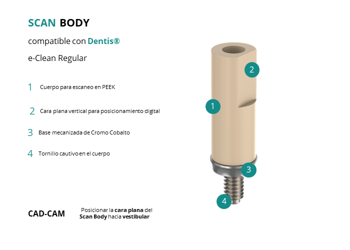 El Scan Body de GT-Medical es compatible con los implantes e-Clean Regular de Dentis®, permitiendo una digitalización precisa de la posición del implante dental para su posterior diseño en un software CAD Dental. Está compuesto por un cuerpo de escaneo de PEEK, una base mecanizada de CrCo y un tornillo de Titanio Grado 5. Esta base mecanizada garantiza un ajuste óptimo con el implante, mientras que su naturaleza metálica radiopaca facilita la visualización en radiografías, asegurando así un posicionamiento correcto del scan body. Ideal para flujos intraorales y extraorales. Consulte las librerías disponibles para exocad y 3shape en el apartado de librerías relacionadas del producto.